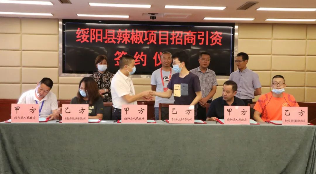 黔商帮、瑞士布勒公司、贵州黔满家绿色食品有限公司、四川省川椒种业科技有限责任公司、河北鑫晟食品机械有限公司、四川省丹丹郫县豆瓣集团股份有限公司、贵州美之选食品有限公司、新疆盛泽源农业科技有限公司与绥阳县人民政府现场签订投资意向协议,将在绥阳这片沃土上投资合作、互利共赢,全力推动绥阳辣椒产业高质量发展。