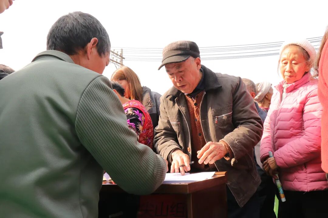 在签字登记处,村民们排队等候,准备签字画押领取属于自己的分红。签名在登记册上接连落下,崭新的纸币在阳光下泛着温润的光泽,村民们接过分红时的轻声道谢与爽朗笑声,在院坝上方久久回荡。