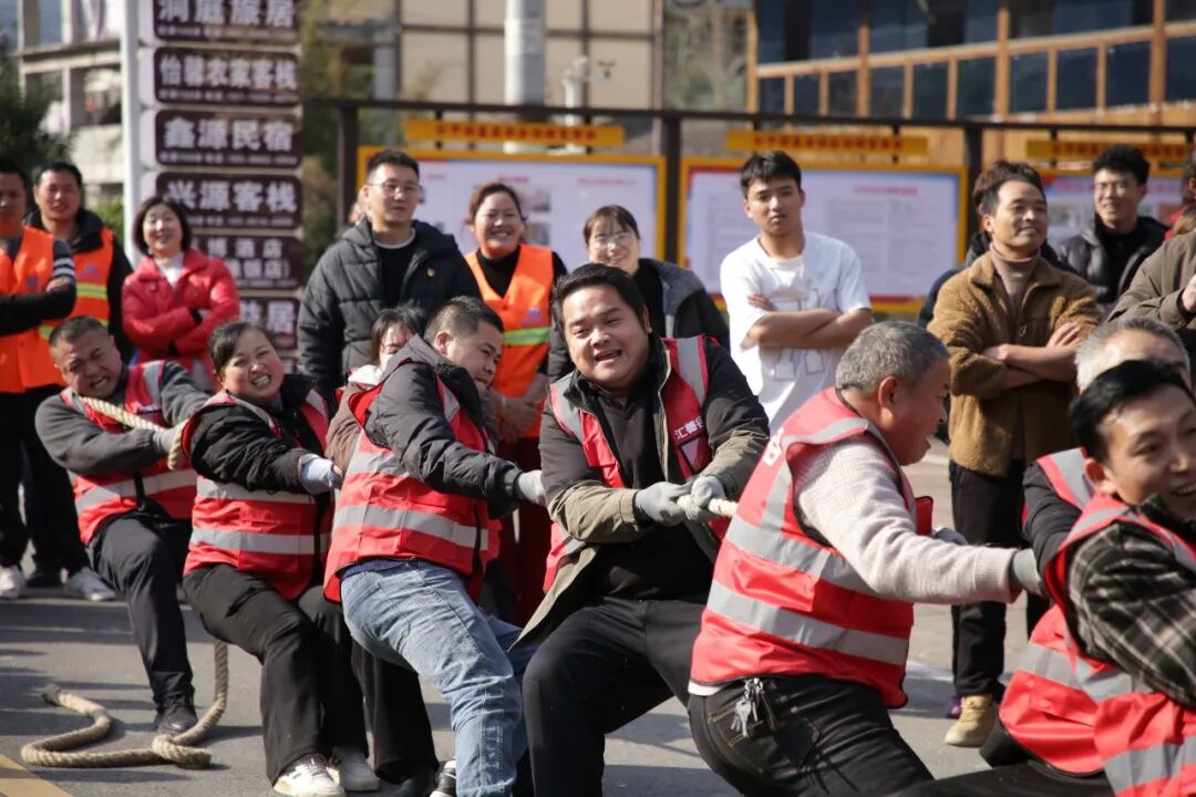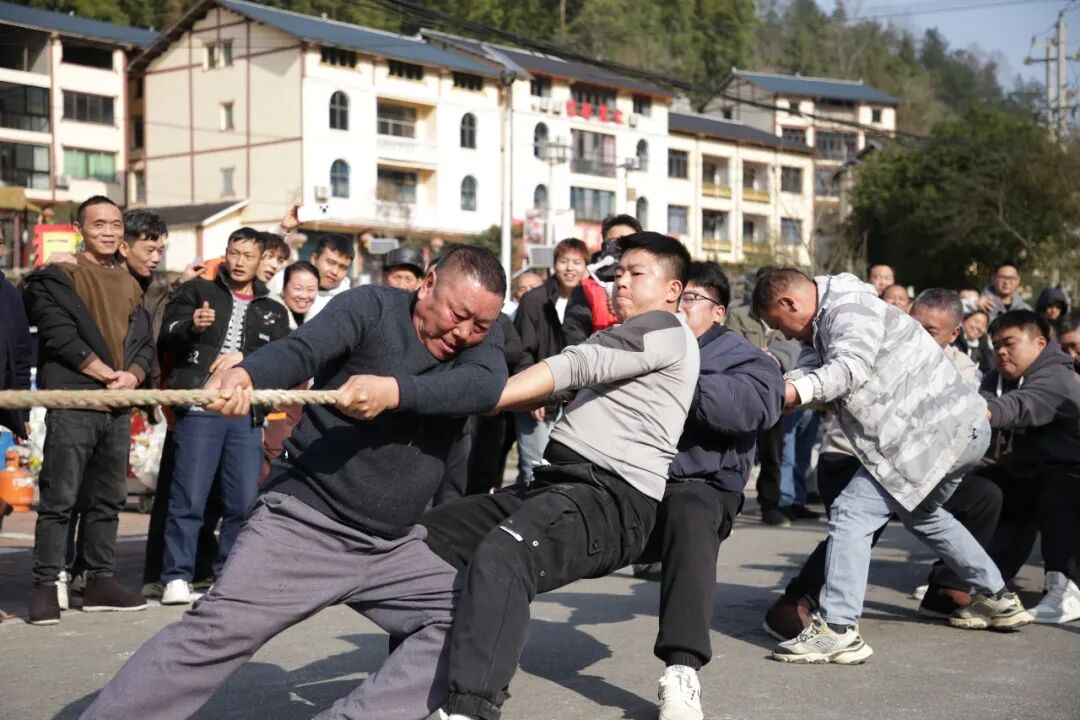 “预备——开始!”拔河比赛现场,呐喊声震天。由各村民小组组成的队伍正僵持不下,绳索中央的红布条缓缓移动,最终一方获得胜利,欢呼声顿时响起。