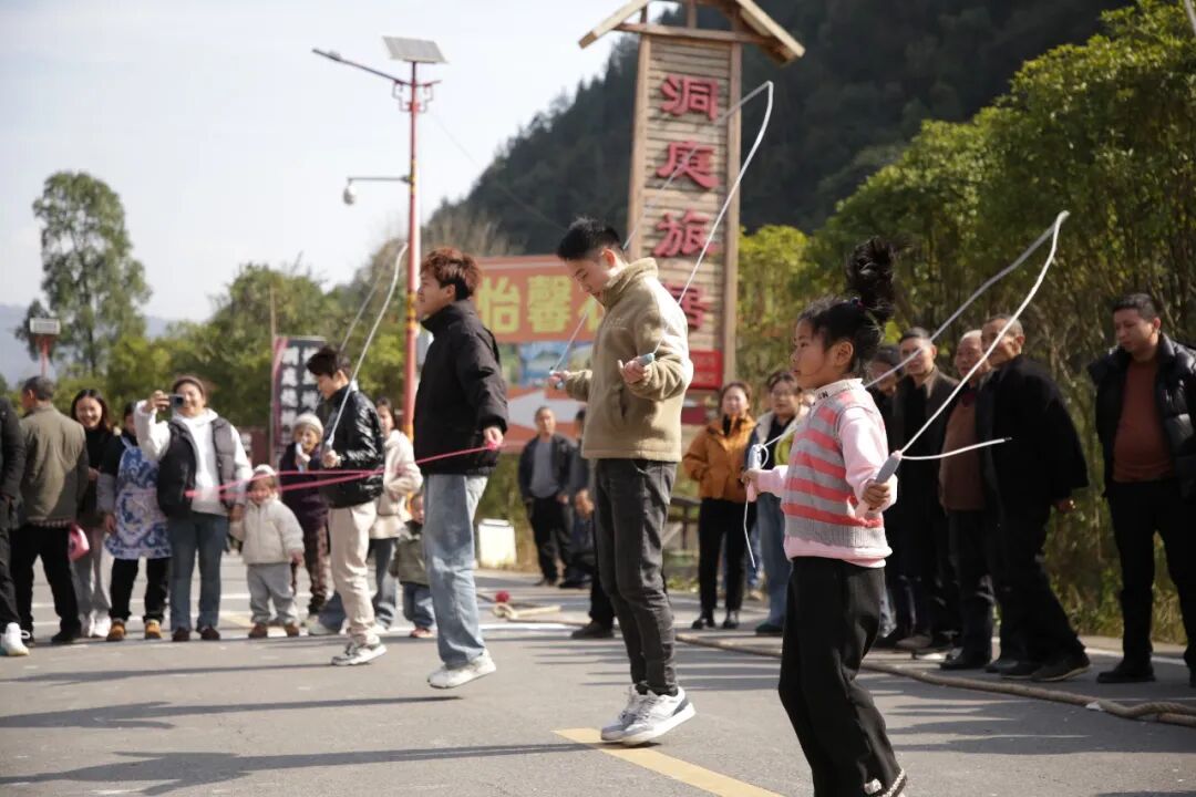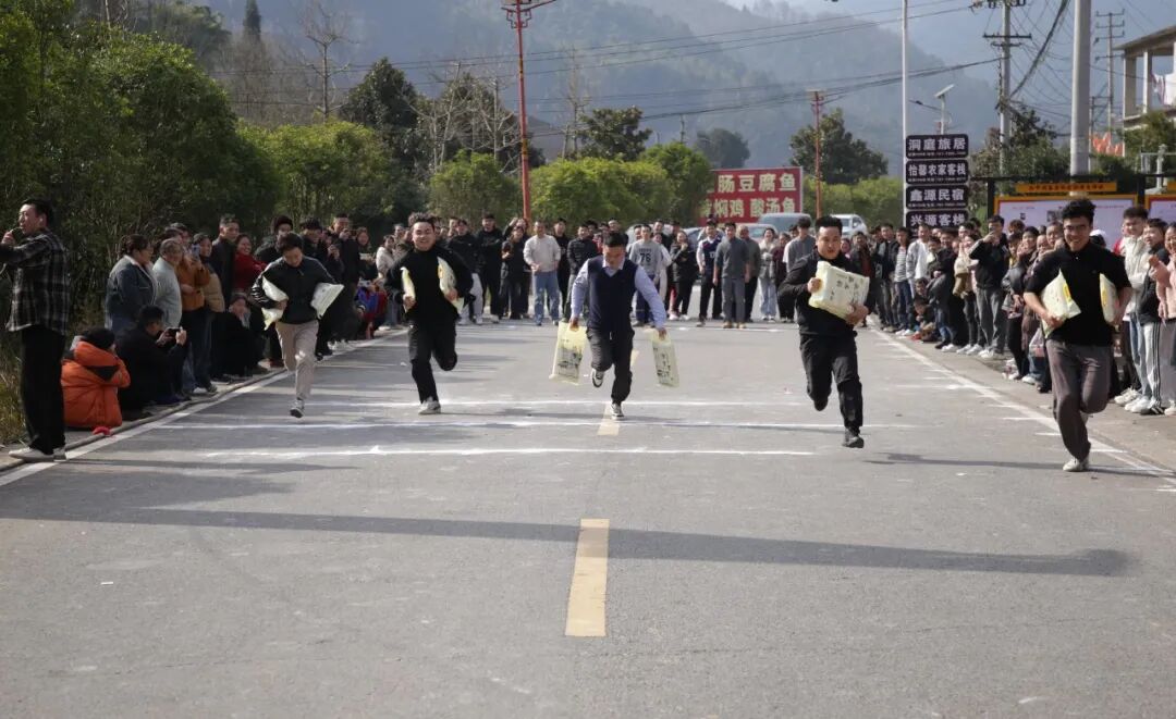 午后,运动会进入趣味比赛环节。公平村民宿示范带广场上,跳绳比赛、运粮接力、拔河比赛、竞技抓鸡等项目依次展开;现场同时设置了打糍粑、送春联、猜灯谜等传统年俗活动区域。