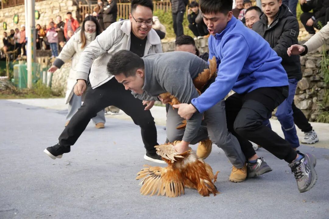 最热闹的要数竞技抓鸡比赛。围栏内,灵活的土鸡四处飞奔,参赛者需在规定时间内徒手捕捉。村民陈洪刚成功抓到一只后兴奋地说,“好久没这么热闹了,这让我想起小时候的乐趣,今天抓到的不只是鸡,更是新一年的好彩头!”