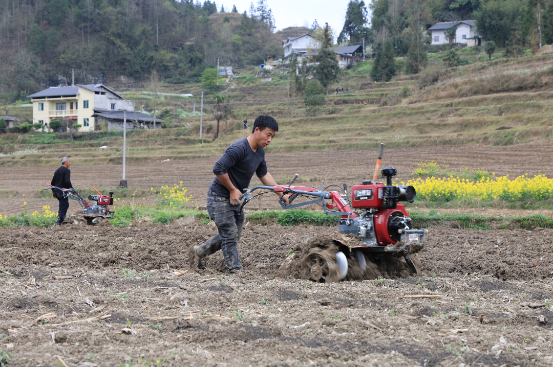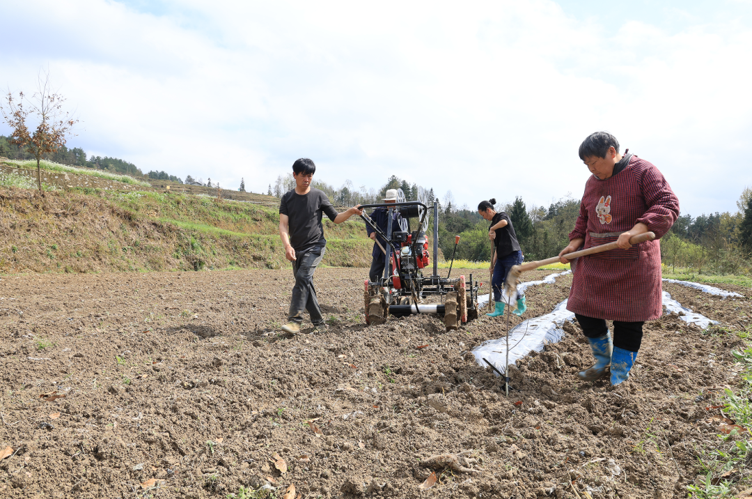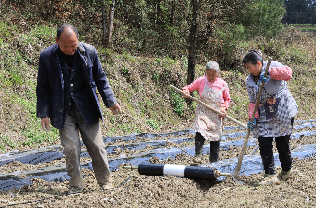 走进团山村贝贝南瓜种植基地,田垄整齐划一,机器轰鸣,村民们分工协作,有的挥锹起垄,有的用机器铺设地膜,每一道工序都有条不紊。