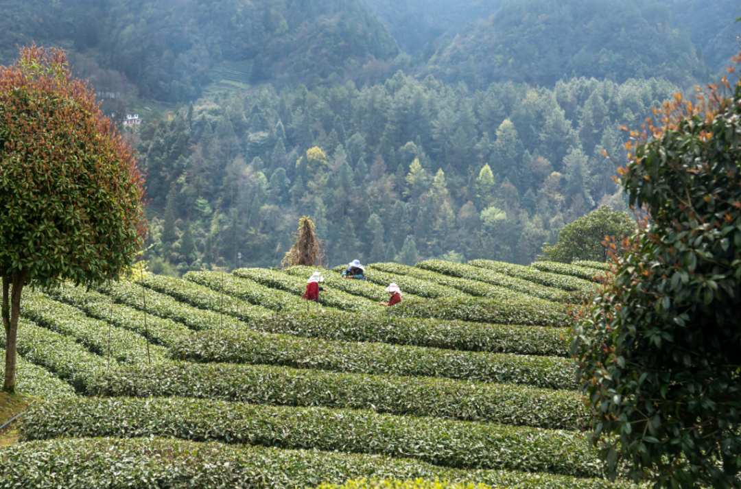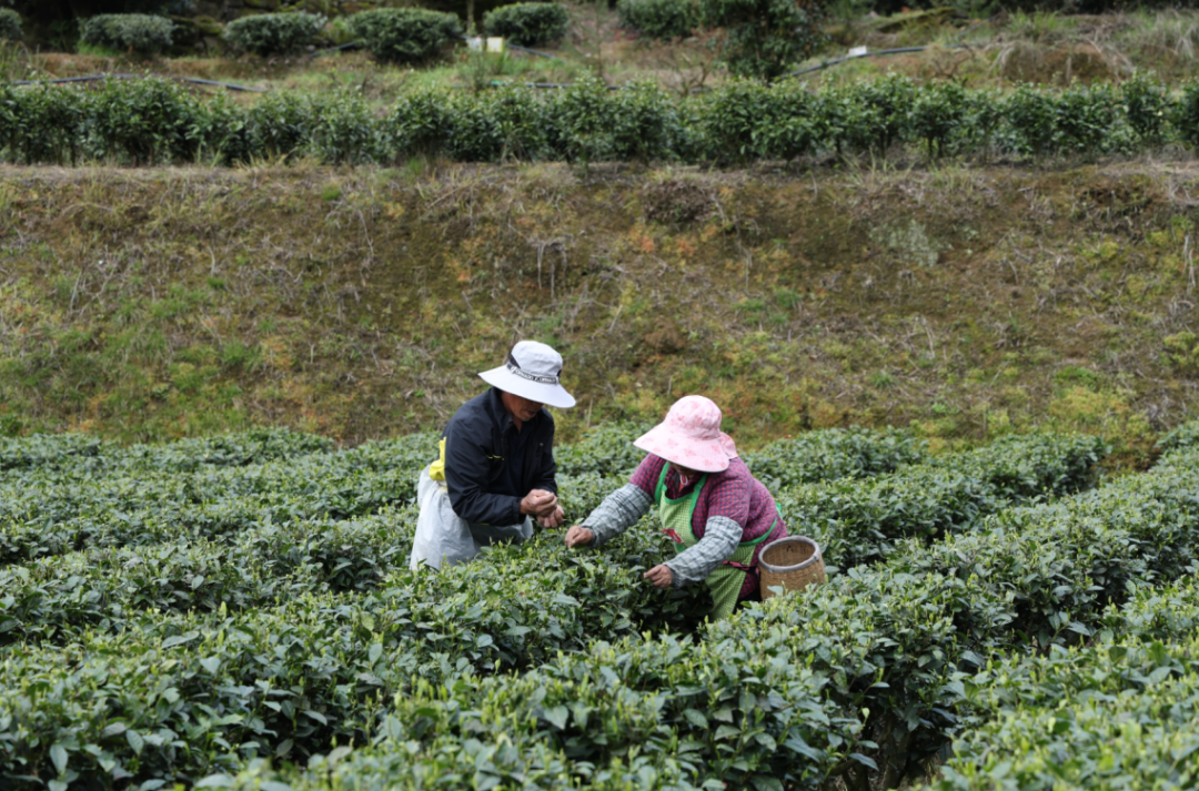 茶农们腰挎竹篓,穿梭于葱郁的茶垄中,指尖轻盈翻飞间,一片片肥嫩的茶芽便落入篓中,清脆的采摘声、爽朗的谈笑声,与山间的清风和淡淡的茶香交织在一起,勾勒出一幅生机盎然的春日采茶盛景。