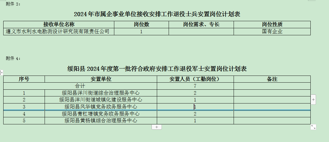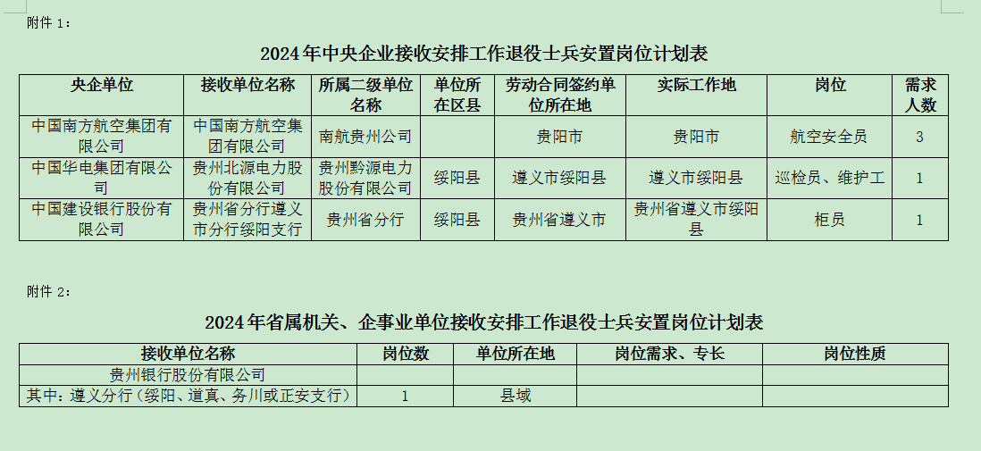 根据《中华人民共和国退役军人保障法》及相关文件规定,对上级下达的中央企业、省属单位、市直单位接收2024年安排工作退役士兵安置岗位计划任务、绥阳县2024年度接收安排工作退役士兵安置岗位计划,向社会公开。