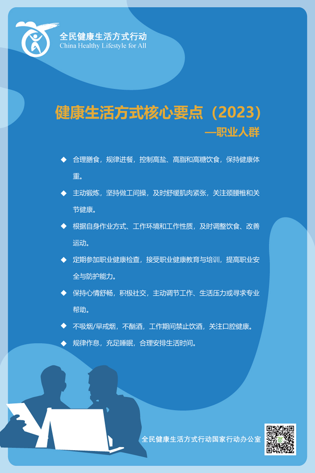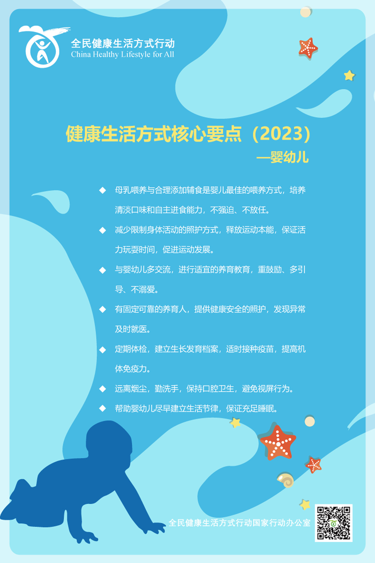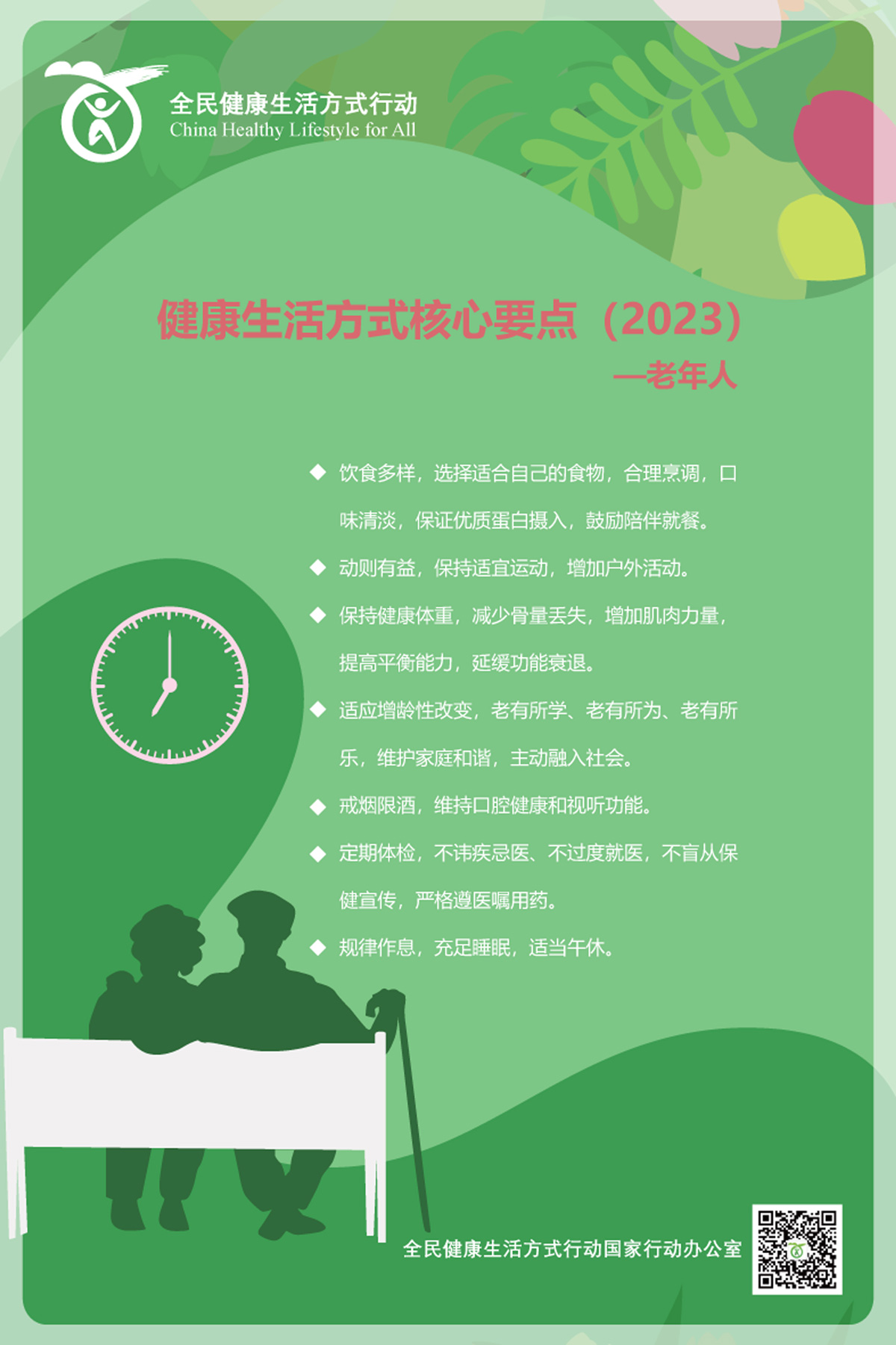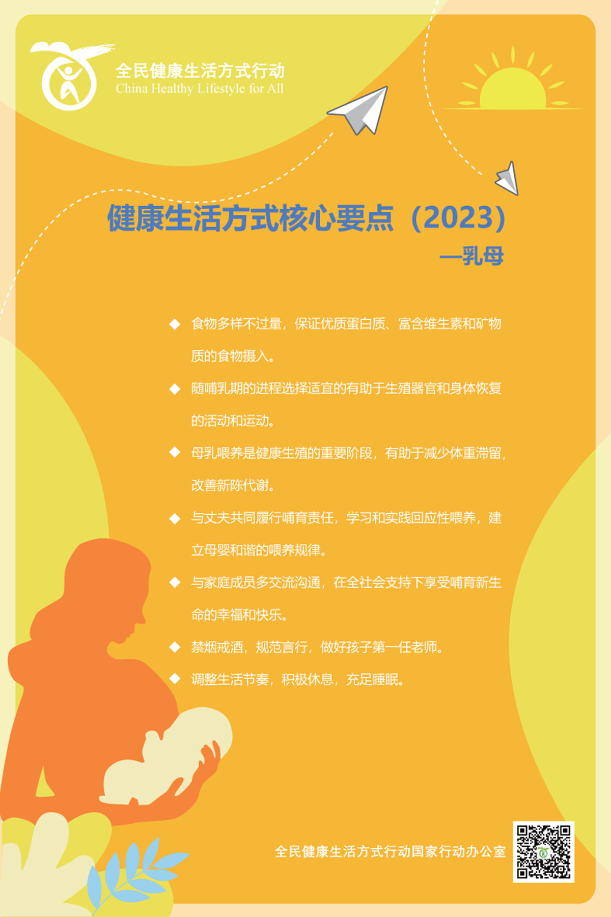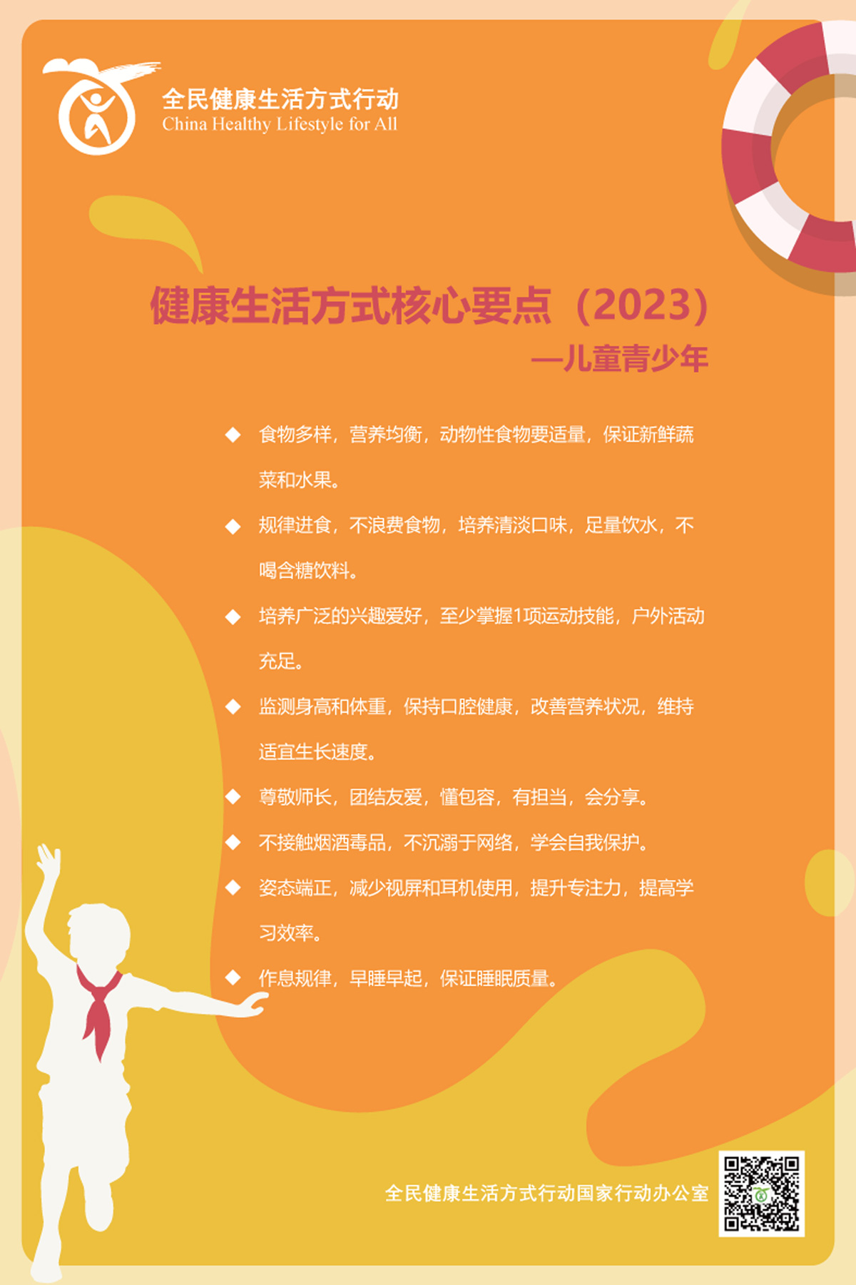生活方式是指所有与人类生存和发展密切相关的行为模式和习惯。健康生活方式是指个体或群体为实现全生命周期的最佳健康目标而采取的行为模式,具有明显的时代性、地域性和人群特征,主要包括合理饮食、规律运动、戒烟限酒、心理平衡、良好睡眠、积极社交、主动学习等。为加强基层慢性病防治和管理能力,提高公众健康素养和幸福感,全民健康生活方式行动国家行动办公室根据健康生活方式、生命早期营养与慢病防控的相关理论,结合我国不同人群当前存在的健康问题,组织专家从倡导文明健康生活方式的角度,制定了针对孕妇、乳母、婴幼儿、儿童青少年、职业人群及老年人的健康生活方式核心要点: